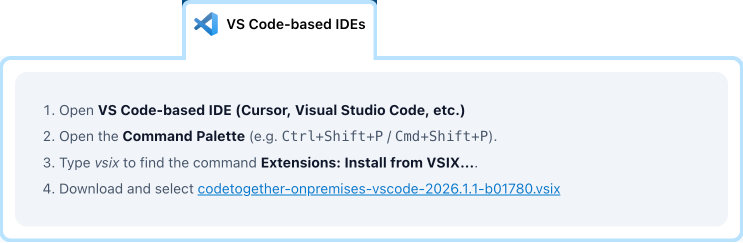 Cursor Installation: Improved installation instructions for Cursor, specifically detailing how to access "Install from VSIX" from the command palette since standard VS Code UI elements may differ.