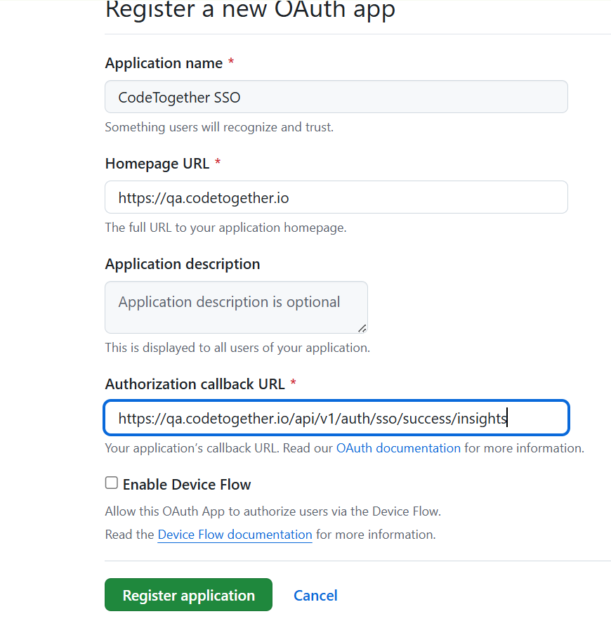 This guide explains how to create and configure a GitHub OAuth App for CodeTogether SSO.